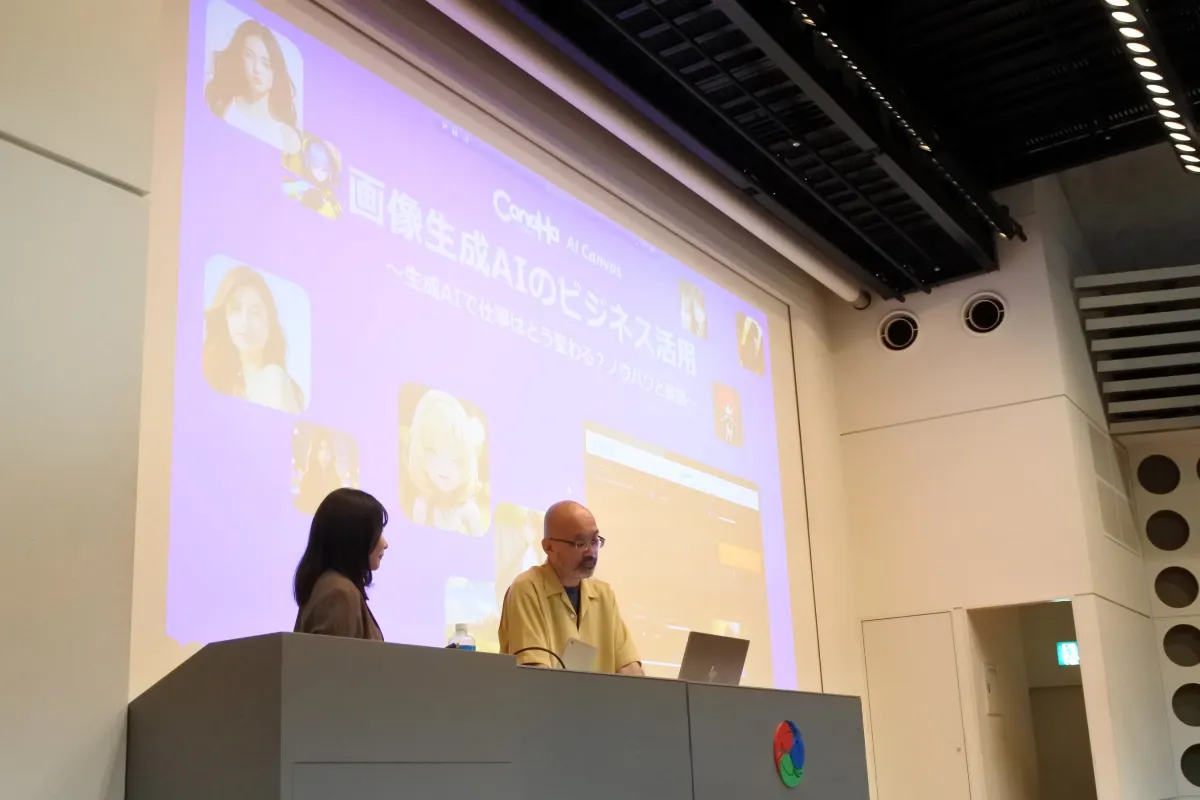 続いて、実際にAIを使った画像生成サービス「ConoHa AI Canvas」のデモが行われ、学生たちはAIの実力を目の当たりにしました。そして、板垣氏は画像生成AIを用いたデザイン例を紹介し、「これからは、よりAIに親しんだ世代のクリエイターと競うことになる」と強調しました。これには、参加した多くの学生が真剣に耳を傾け、身の引き締まる思いを抱く時間となりました。
