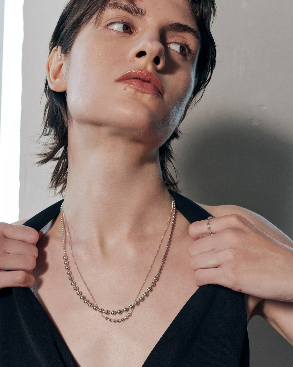 新作ジュエリーの最大の特徴は、特有の艶やかさとすっきりとしたルックを持つボールチェーンです。編み込んだチェーンとは異なり、カジュアルさとモダンな印象を融合させたそのデザインは、どんなスタイリングにも新しいエッジを加えることができます。コーディネートの幅を広げるためのアイテムとして、非常に適しています。