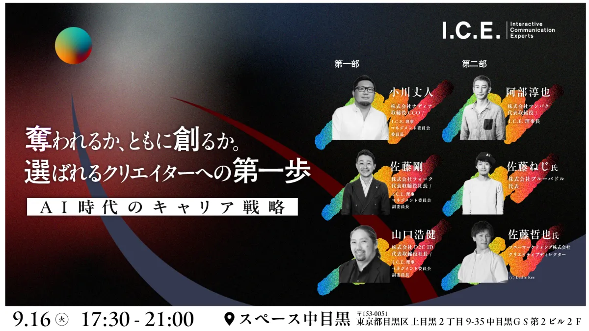 2025年9月16日、一般社団法人I.C.E.が主催するセミナー「~奪われるか、ともに創るか。選ばれるクリエイターへの第一歩~『AI時代のキャリア戦略』」が、東京・中目黒で開催されます。このセミナーは、デジタルクリエイティブ業界の未来を見据えた重要なイベントです。