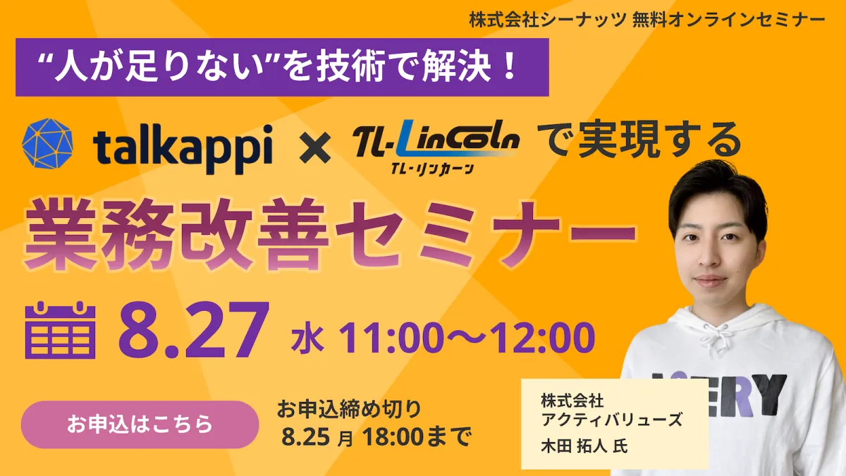 本セミナーのテーマは、「“人が足りない”を技術で解決!talkappi × TL-リンカーンで実現する業務改善セミナー」です。私たちの生活が急速にデジタル化している中、宿泊業界も例外ではありません。アクティバリューズが提供する「talkappi」と、シーナッツが提供する「TL-リンカーン」を組み合わせることで、業務を効率化し、顧客満足度を向上させる方法を学ぶことができます。