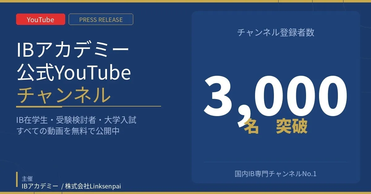 株式会社Linksenpaiが運営するIBアカデミーの公式YouTubeチャンネル(@linksenpai)が、2026年3月に登録者数3000名を突破しました。このチャンネルは、日本国内で国際バカロレア(IB)に特化した専門チャンネルとして、最大の規模を誇ります。IBアカデミーは、国際バカロレア教育の情報を提供し続けており、その教育的価値が高く評価されています。