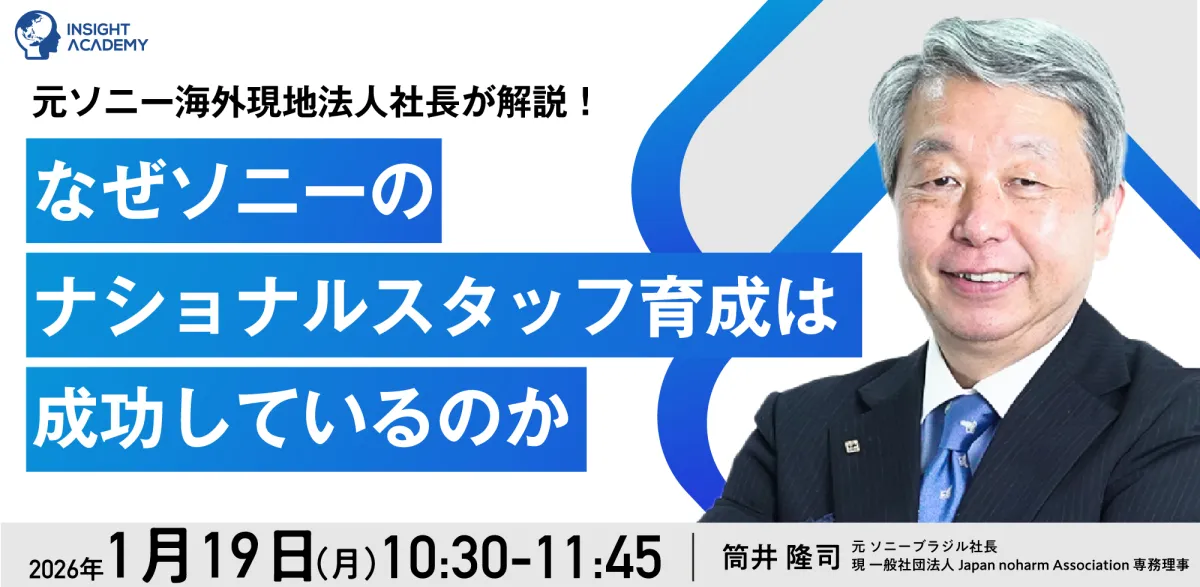 インサイトアカデミー株式会社は、2026年1月19日(月)に無料のオンラインセミナー「【元ソニー海外現地法人社長が解説!】なぜソニーのナショナルスタッフ育成は成功しているのか」を開催します。今回は、元ソニー社長の筒井隆司氏を講師に迎え、ナショナルスタッフ育成の具体的な方法や成功要因について深掘りしていきます。
