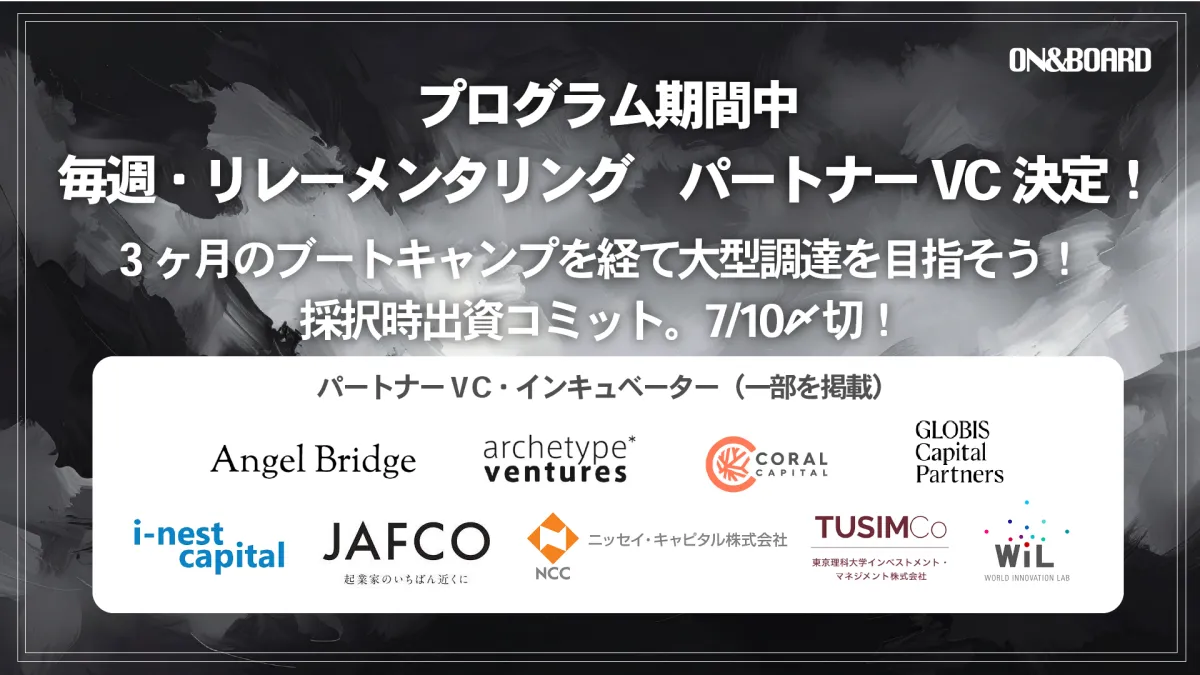 このプログラムでは、選ばれた起業家たちに対し、ON&BOARDから創業資金の出資が約束されます。これにより、資金面での不安を軽減し、事業活動に集中できる環境が整えられます。