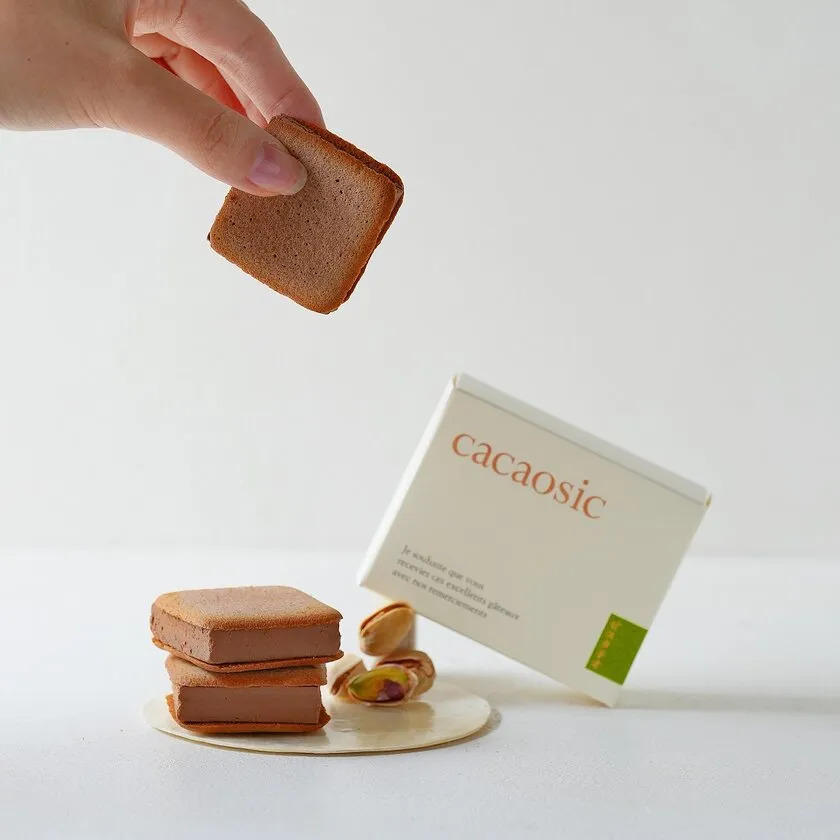 本バレンタインボックスには、厚さ10mmのチョコレートをラングドシャでサンドした「カカオシック」が4個入っています。フレーバーは、定番の「ピスタチオ」や「ストロベリー」に加え、期間限定の「モンブラン」と「ショコラオレ」を用意。どれも一口で心を弾ませる味わいが詰まっています。特に、空気を抱き込ませる特別な製法で作られたエアリーなチョコレートは、本当に抜群の食感です。