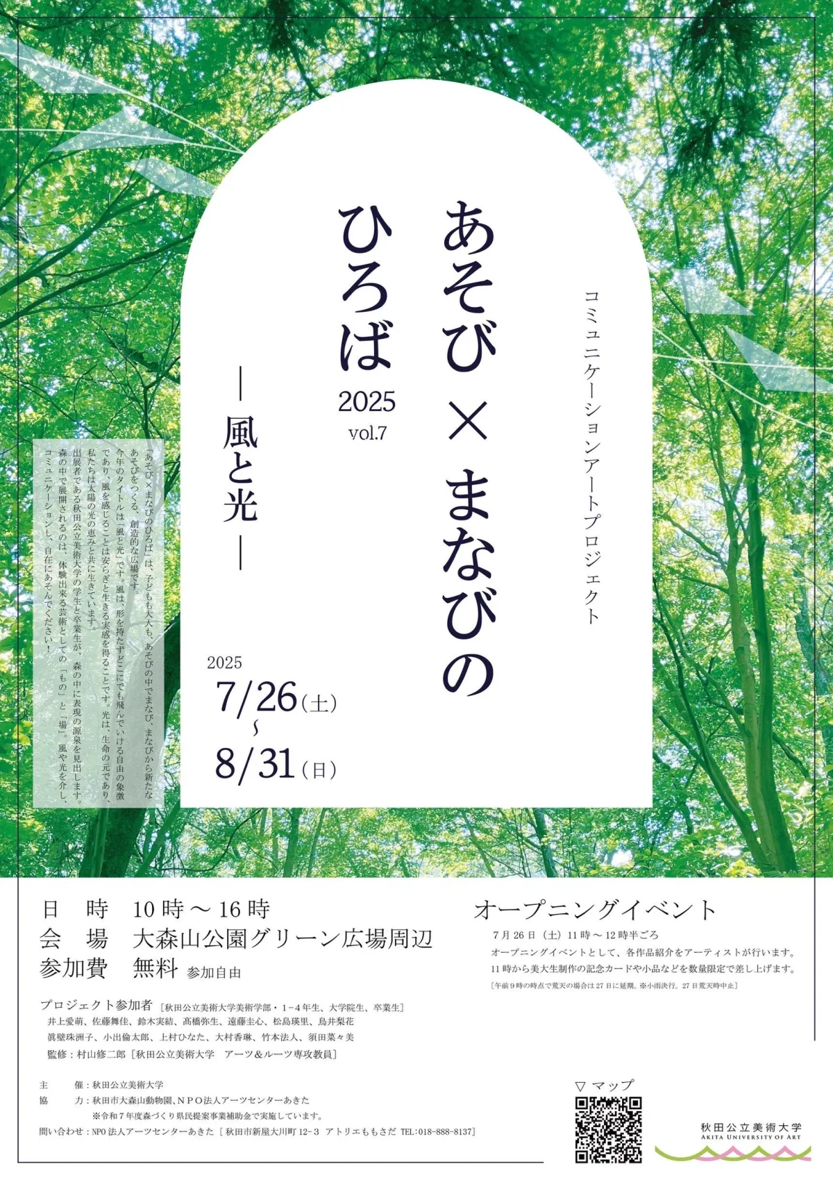 『あそび×まなびのひろば』は、森の中で子どもたちや大人たちが自由に遊び、学び、それによって新たな発見をすることを目的としています。これは、令和7年度森づくり県民提案事業としても認可されており、自然と芸術の融合をテーマにしています。秋田公立美術大学の学生や卒業生、教員が手を組み、参加者がアートに触れながら自然の中での経験を楽しむことができます。
