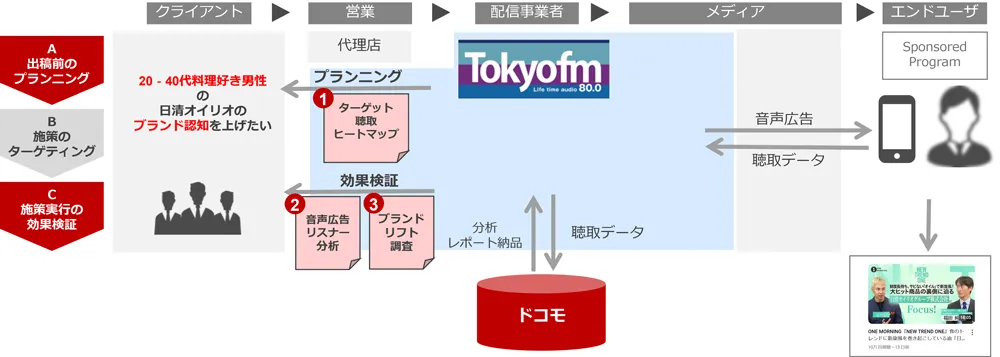月間約900万人のユーザーを抱える「radiko」において、エフエム東京が保有する聴取データと、NTTドコモが持つ「dポイントクラブ」会員基盤に関するデータ、さらにインテージが保有する各種マーケティングデータを融合させ、広告主に対して効果的なターゲティングを実現します。これにより、広告の効果を定量的に測定しやすくします。ラジオ番組内で流される音声広告は、一般に多くのリスナーにリーチできる一方で、ターゲット層への正確な到達や効果測定が難しいという課題があります。この新しいサービスはその課題を克服するものです。