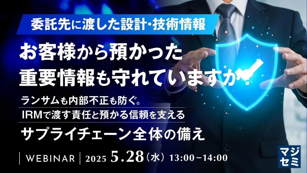 近年、企業間での情報共有が進む中、機密情報の管理がますます重要視されています。委託先に設計や技術情報、お客様から預かった重要情報を適切に守れるかどうか、というテーマを扱ったウェビナーが開催されます。このセミナーでは、データを「渡す責任」と「預かる信頼」という観点から、企業価値がどのように左右されるのかを掘り下げていきます。