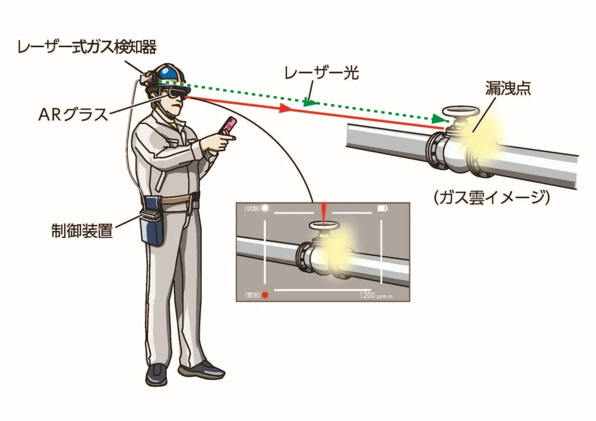 作業者は、レーザー式ガス検知器を搭載した特別なヘルメットを着用し、特定の方向に視線を向けるだけでガス漏洩検査が実施できるようになります。また、ARグラスを通じて作業者の視野にガスの拡散状況が可視化され、より効果的な漏洩探索が可能となります。