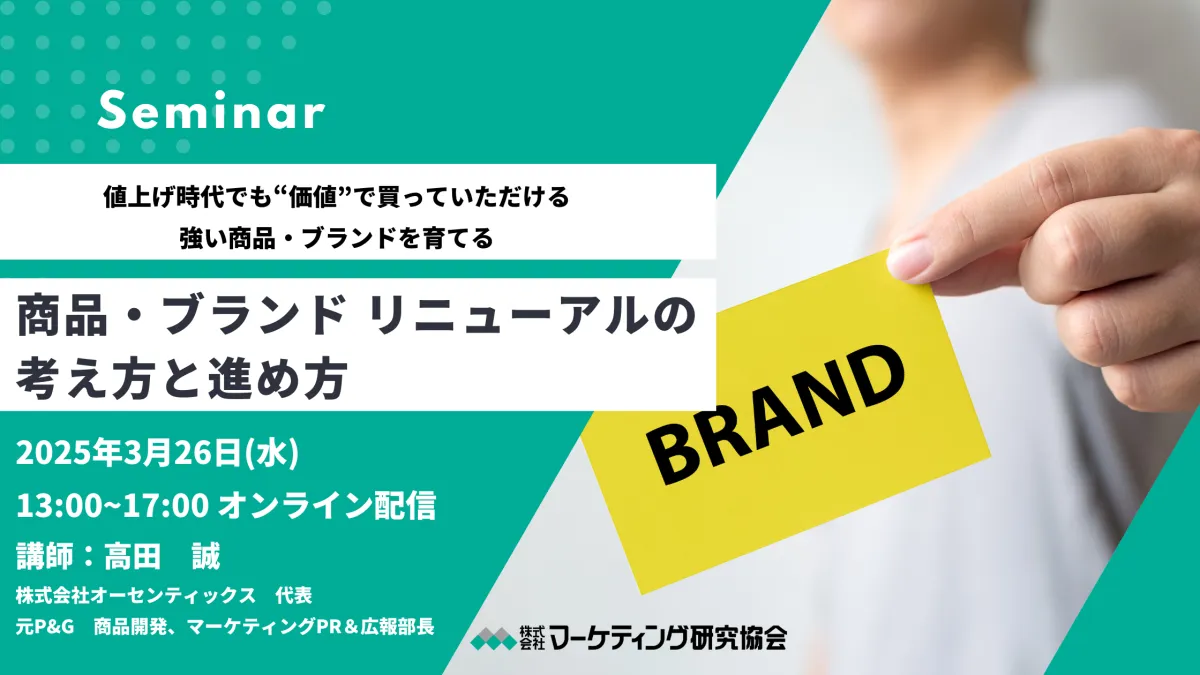 2025年3月26日、株式会社マーケティング研究協会は「商品・ブランドリニューアルの考え方と進め方」というテーマでセミナーを開催します。近年、さまざまな環境変化により、企業は商品やブランドのリニューアルに苦慮しています。このセミナーでは、元P&Gの商品の開発に関わってきた高田誠氏が講師を務め、成功へ導くための具体的なノウハウや戦略を解説します。