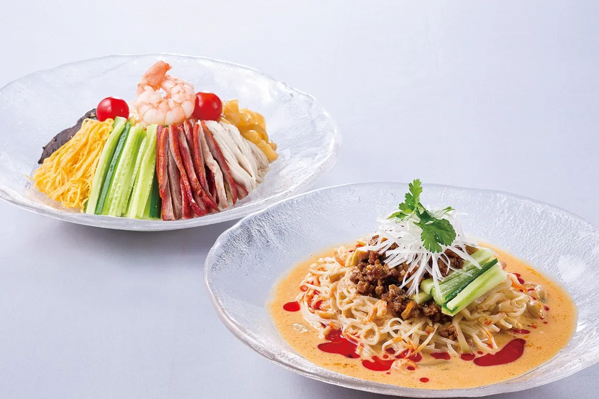 まず紹介したいのが、ホテルの2階に位置する中国料理店「南園」です。こちらでは、1971年のホテル開業以来、多くの人々に愛され続けている「南園特製五目入り冷やしそば」が楽しめます。このメニューは、海老や錦糸卵、特製チャーシューなど、全9種類の具材が華やかに盛り付けられており、見た目も美しい一皿です。さらに、香ばしい胡麻ダレまたは爽やかな柚子醤油ダレの2種類から自分の好みに合った味を選ぶことが可能です。