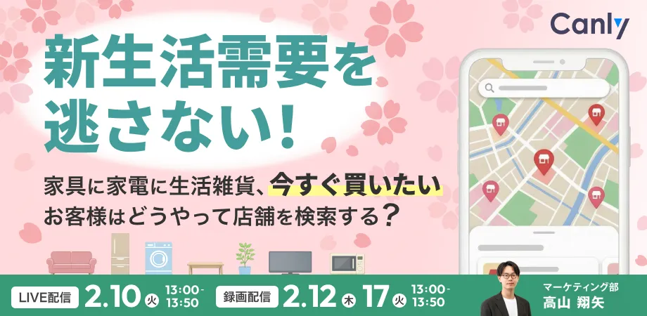 株式会社カンリーは、2026年2月10日、12日、17日にかけて「新生活需要を逃さない!家具に家電に生活雑貨、今すぐ買いたいお客様はどうやって店舗を検索する?」というテーマでオンラインセミナーを実施します。このセミナーでは、消費者の購買行動に関するアンケート結果をもとに、新生活需要を強化するための具体的な集客戦略が紹介されます。営業担当者や経営者にとって、多くのヒントを得られる機会です。