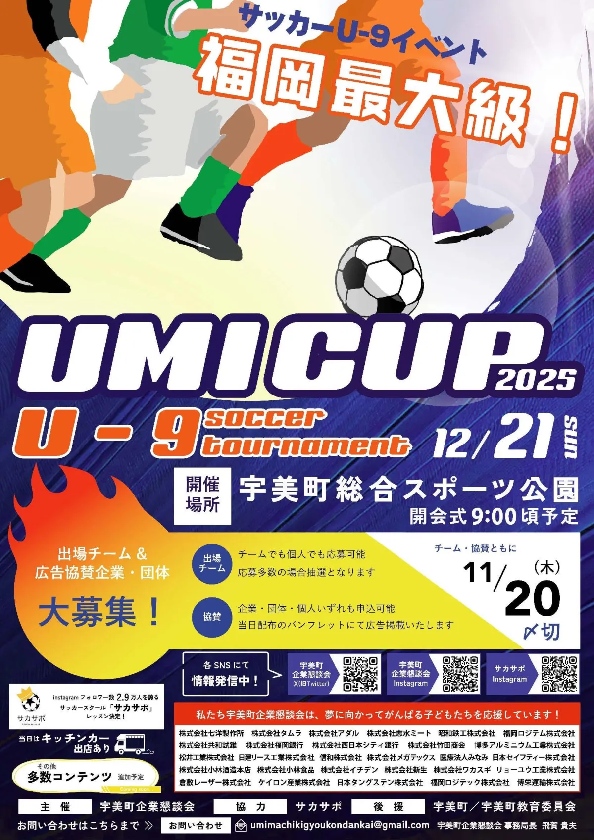 この大会は、地元の未来を担う子どもたちの成長を支援することを目的とし、地域社会の結束を深めることも狙いとしています。昨年の「UMIカップ 2024 U-9サッカー大会」でも、24チームが参加し、選手たちによる熱き戦いが繰り広げられたことから、地域住民・関係者から多くの評価を得ました。