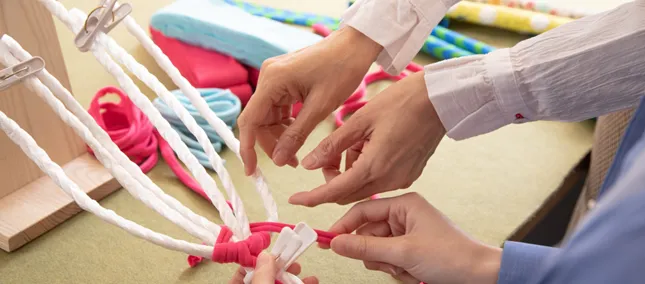 次に、「専門コース」では、さらに高度な編み方やオリジナルデザインの制作を学ぶことができます。また、布を再利用したサステナブルな布ぞうり作りにも力を入れており、将来販売を視野に入れた方には実践的なノウハウも提供。