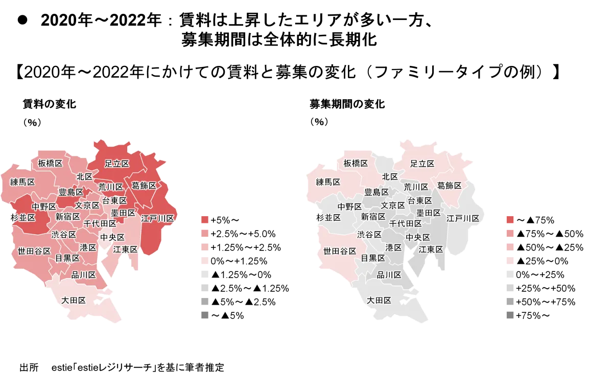 レポートによれば、募集期間は賃料変化に対して先行して動く傾向があるとされています。この特徴を活用すれば、短期的な市場予測を行う上で貴重なデータとなる可能性があります。例えば、賃貸マンションの募集期間が以前よりも短くなった場合、賃料が上昇する前触れとして解釈できるかもしれません。