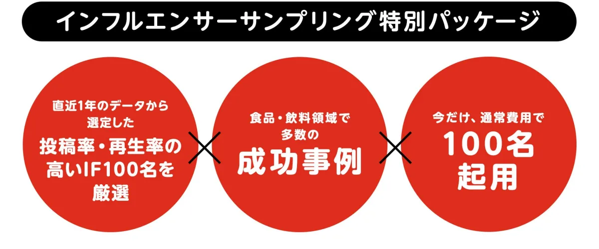 この特別プランは、通例50名に提供しているサンプリングを、期間限定で倍増の100名に拡張したものです。対象となるのは、食品や飲料業界で活動する企業。この施策は2025年11月末まで申し込むことができ、特にSNSの再生率や投稿率で実績のあるインフルエンサーに絞られているため、非常に効果的です。