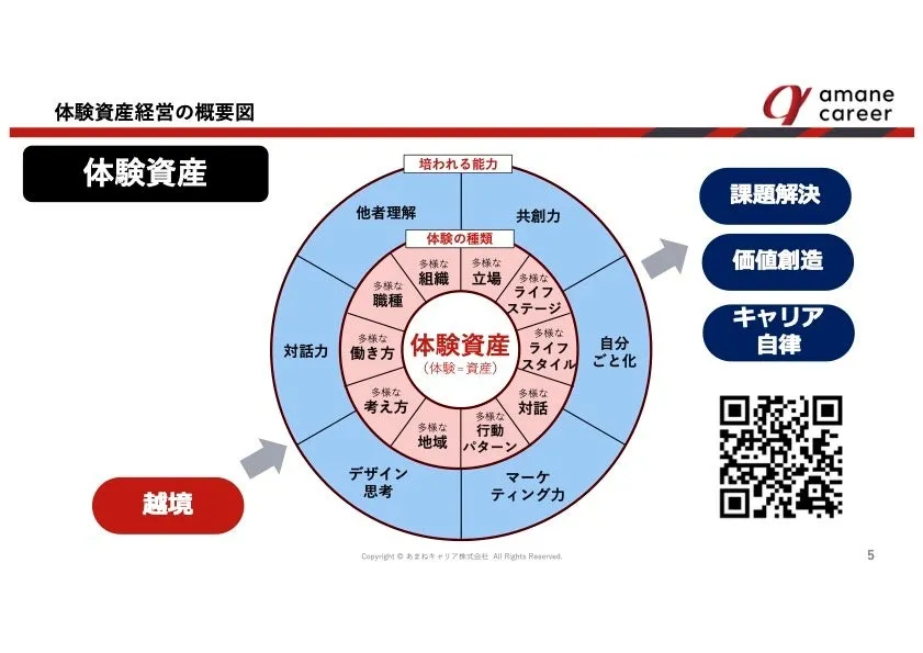 体験資産経営は、個の多様な体験を企業の戦略的資産として位置づけ、リスペクトして育成する経営フレームワークです。この考え方はあまねキャリアによって提唱され、プロティアン・キャリア協会との共同でその実装が進められています。このアプローチにより、個人のキャリア自律や企業の課題解決、および新たな価値の創造が促進されることを期待しています。