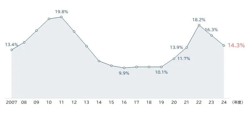「ゾンビ企業」という言葉は、国際決済銀行(BIS)が定義した基準に基づいています。具体的には、設立から10年以上経過し、インタレスト・カバレッジ・レシオ(ICR)が3年間連続で1未満の企業を指します。2024年度においては、11万9,027社中1万6,966社がこの基準に該当とされ、ゾンビ企業率が14.3%と試算されています。