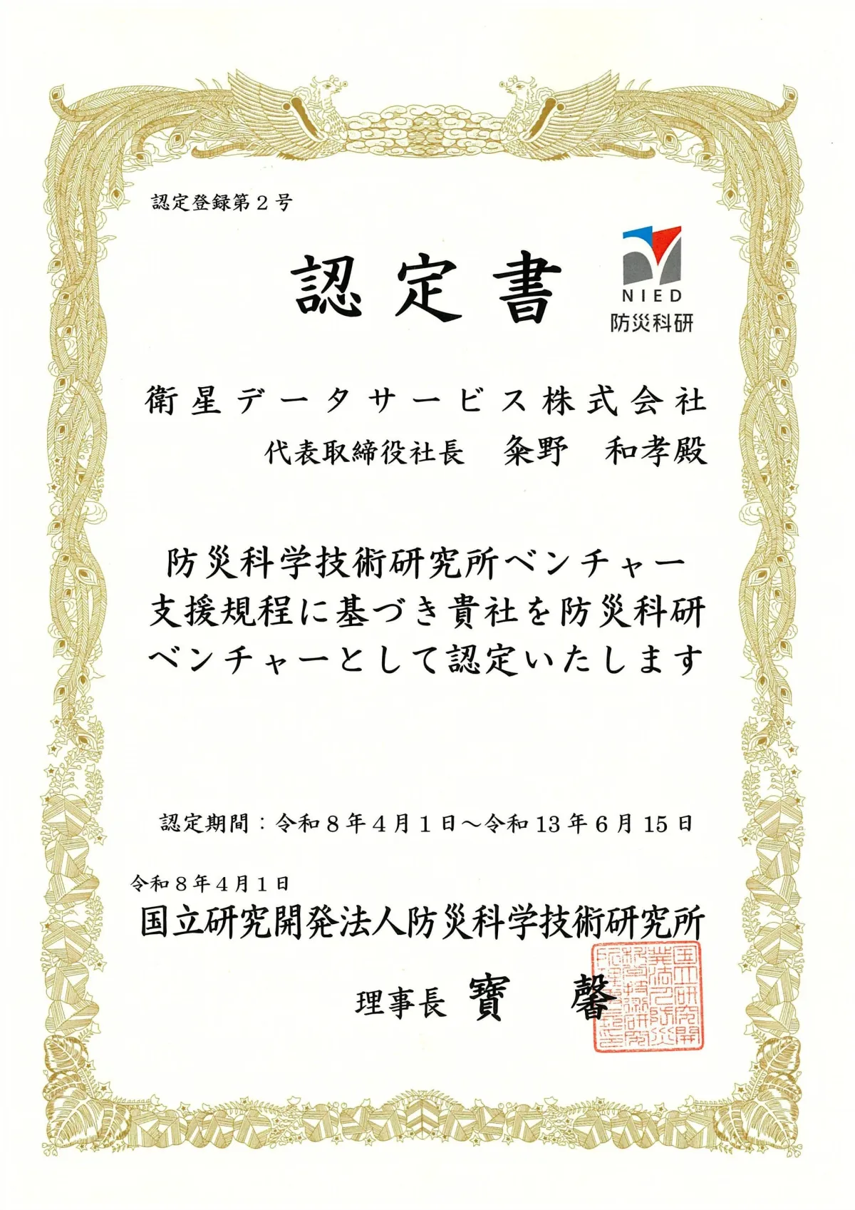 衛星データサービス株式会社は、2026年4月1日付で国立研究開発法人の防災科学技術研究所から、防災科研ベンチャーとしての認定を受けました。この認定を受けたことで、同社はより一層、災害対応の社会実装に向けての活動を強化することができます。