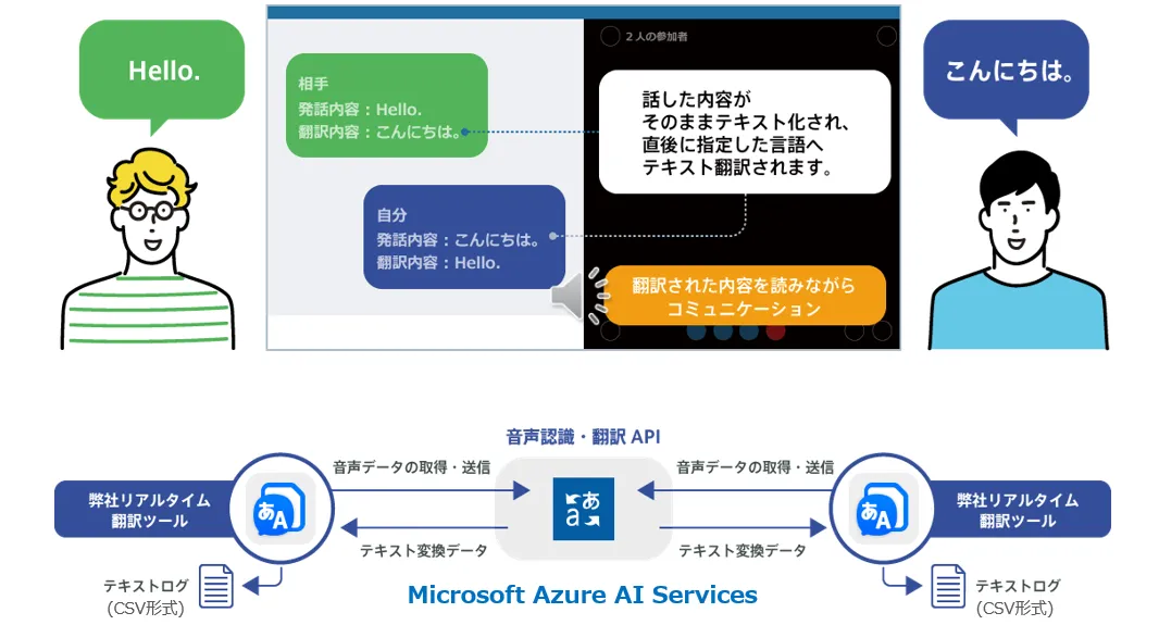 「Real Time Translator」は、ネットワークを介して動作するソフトウェアおよびWebアプリケーションであり、会話の内容をリアルタイムに把握し、発言を翻訳するための強力なツールです。すでに、日本マイクロソフトやトヨタシステムズ、アッヴィなどの企業が導入しており、その有用性が実証されています。