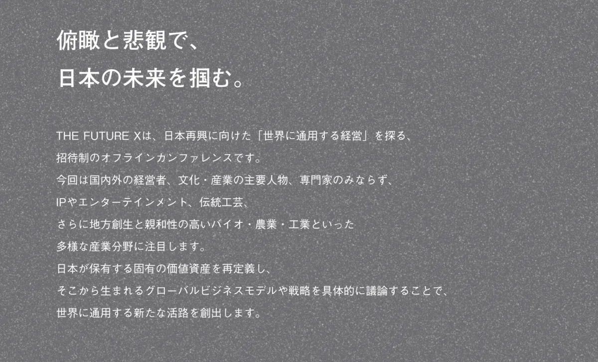 「THE FUTURE X」シリーズは、同時代を生きる意志を持つ実践者たちが集う場を提供することを目的にしています。今年で3回目を迎えるこのカンファレンスでは、国内外から経営者やビジネスリーダーを招待し、異なる産業や分野からの視点を持ち寄ります。これにより、新たなビジョンを「意思決定」する場を提供できるよう努めています。