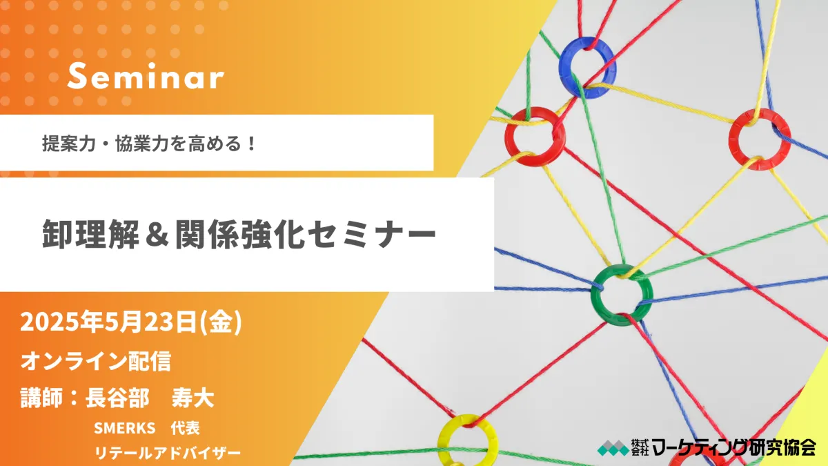 「提案力・協業力を高める! 卸理解&関係強化セミナー」が2025年5月23日にオンラインで開催されます。本セミナーでは、卸業界や卸担当者の視点から営業活動について学び、その結果、営業の生産性を向上させるための具体的な方法をお伝えします。また、卸企業とのより良い関係を築くためのポイントも紹介します。