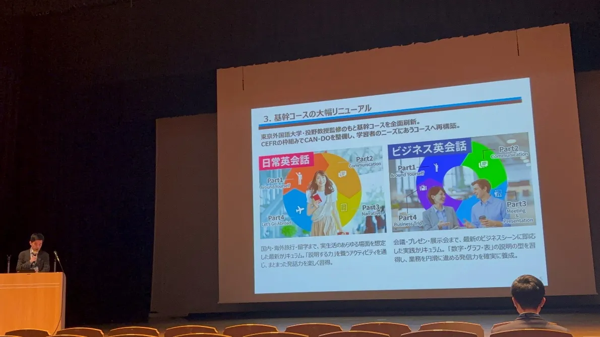 このシンポジウムは、東京外国語大学の投野由紀夫教授が監修した基幹コース「日常英会話」および「ビジネス英会話」のリニューアルをテーマに掲げ、CEFR(欧州言語共通参照枠)に基づく最適化された学習カリキュラムの開発過程が解説されました。これにより、学習者にとってさらに充実した教材が提供されることを目指しています。