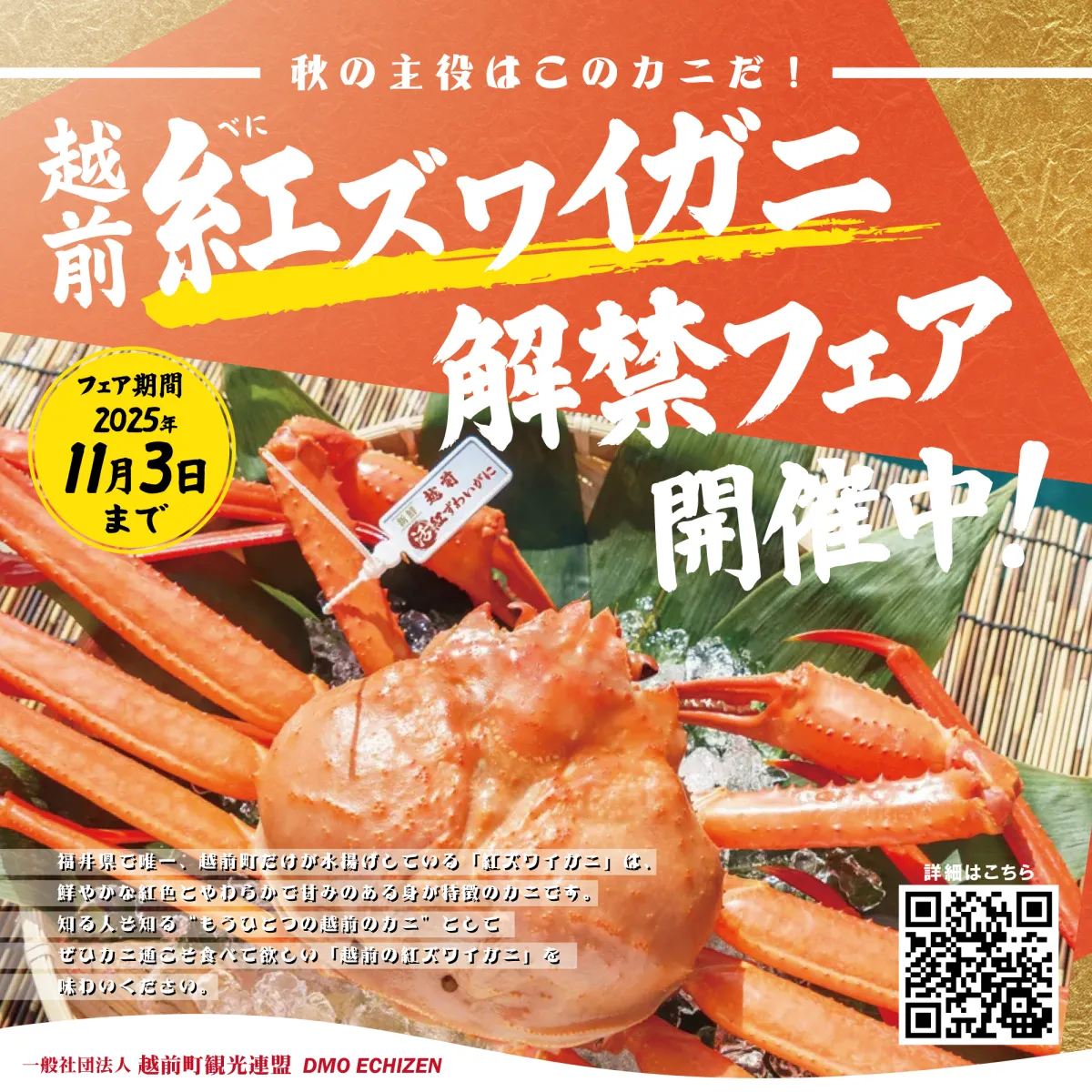 詳しい情報や参加店舗の一覧は、越前町の公式サイトから確認できます。また、SNSでも最新情報が発信されているので、旅行の計画にはぜひチェックしてみてください。秋の味覚の中でも、特に注目の紅ズワイガニを存分に楽しめるこのフェアに、皆さんも足を運んでみてはいかがでしょうか?