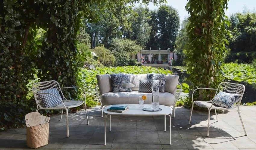 デザイナーのルドヴィカとロベルト・パロンバによるこのソファは、ゆったりとしたデザインで、屋外でも快適なリラックススペースを提供します。耐水性のあるトラマファブリックを使用し、頑丈なフレームは耐食性にも優れています。価格は442,500円(税込)で、別荘やリゾート施設にも適しています。