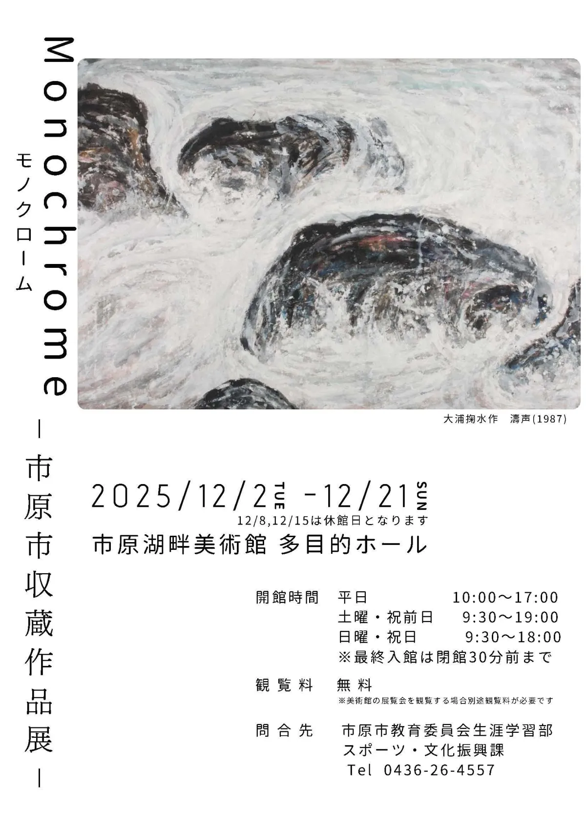 「Monochrome―市原市収蔵作品展―」の開催期間は12月2日から12月21日までで、毎週月曜日が休館日となっております。平日は午前10時から午後5時まで、土曜日や祝前日は午前9時30分から午後7時まで、日曜日や祝日は午前9時30分から午後6時まで開館しています。会場となるのは市原湖畔美術館の多目的ホールで、観覧は無料ですが、通常の美術館の入館料が必要な企画展や常設展があるため注意が必要です。