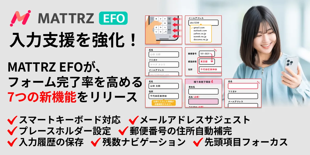 SaaS事業を手掛けるMattrz株式会社が提供するEFOツール「MATTRZ EFO」は、ユーザーの入力体験をさらに向上させる新機能を2025年10月1日より導入しました。これにより、企業のWebサイトにおけるフォーム完了率やコンバージョン率の向上が期待されます。