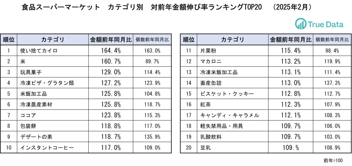 2025年2月の売り上げデータが明らかになりました。昨年とは異なり、今年の冬は西日本を中心に寒波が続き、これが消費動向に大きな影響を与えています。ビッグデータプラットフォームを運営する株式会社True Dataが発表した統計によると、食品スーパーマーケットにおいて特に注目すべきは、米の価格高騰によって代替商品が人気を集めていることです。