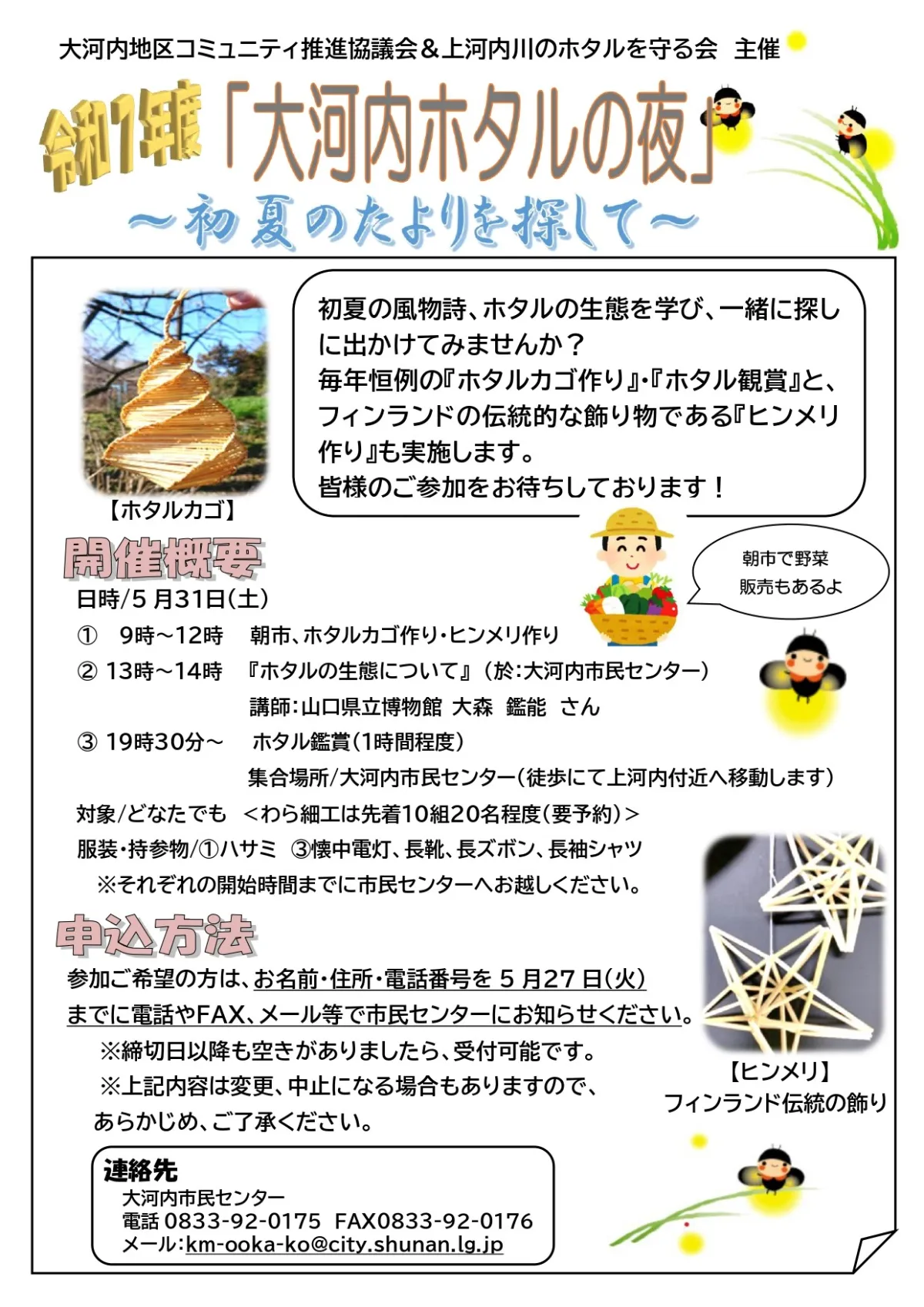毎年、初夏になると訪れる楽しみといえば、ホタルの観賞です。山口県周南市の大河内では、5月31日(土)に特別なイベントが開催されます。このイベントでは、ホタルの生態について学びながら、フィンランドの伝統的な装飾品であるヒンメリ作りを体験します。地域の自然と文化を融合させた素晴らしい機会です。