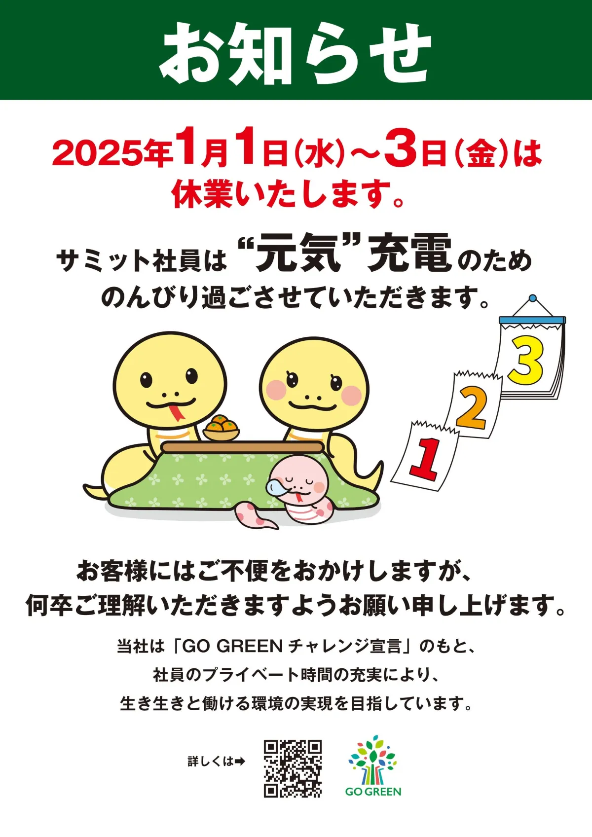 サミットは、お客様に対してこの休業期間中にご不便をおかけすることに対し、深くお詫び申し上げます。社員の元気充電という目的を理解し、ご協力いただけるようお願い申し上げます。元気を充電した社員たちが、1月4日から皆様を笑顔でお迎えできるよう、準備を行います。