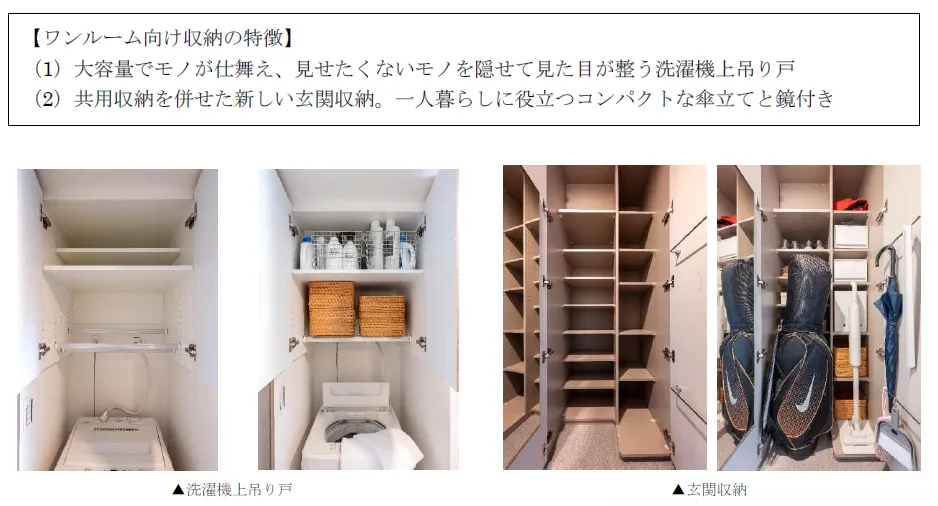 三菱地所レジデンス株式会社が新たに開発した「ワンルーム向け収納」は、一人暮らしの生活を以下のように改善することを目的としています。限られた居住空間を有効に活用しつつ、機能性とデザインを両立。特に注意したのは、洗濯機周りや玄関の収納。