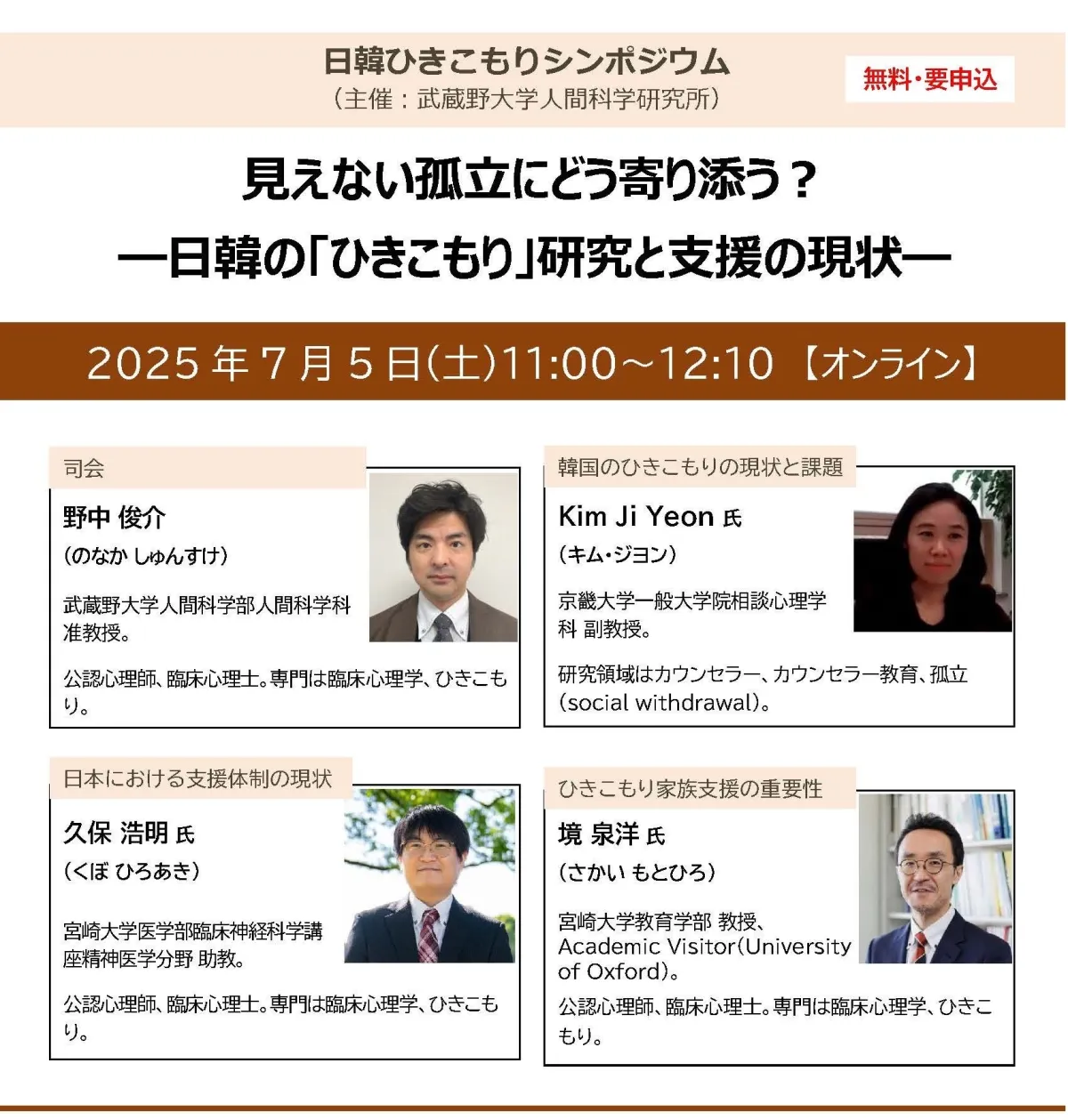 2025年7月5日、武蔵野大学人間科学研究所は「見えない孤立にどう寄り添う? 日本と韓国のひきこもり研究と支援の現状」と題したミニ・シンポジウムをオンラインで開催します。このシンポジウムでは、日韓の専門家による最新の研究結果や支援体制について紹介され、参加者がひきこもりに関する理解を深めることを目的としています。