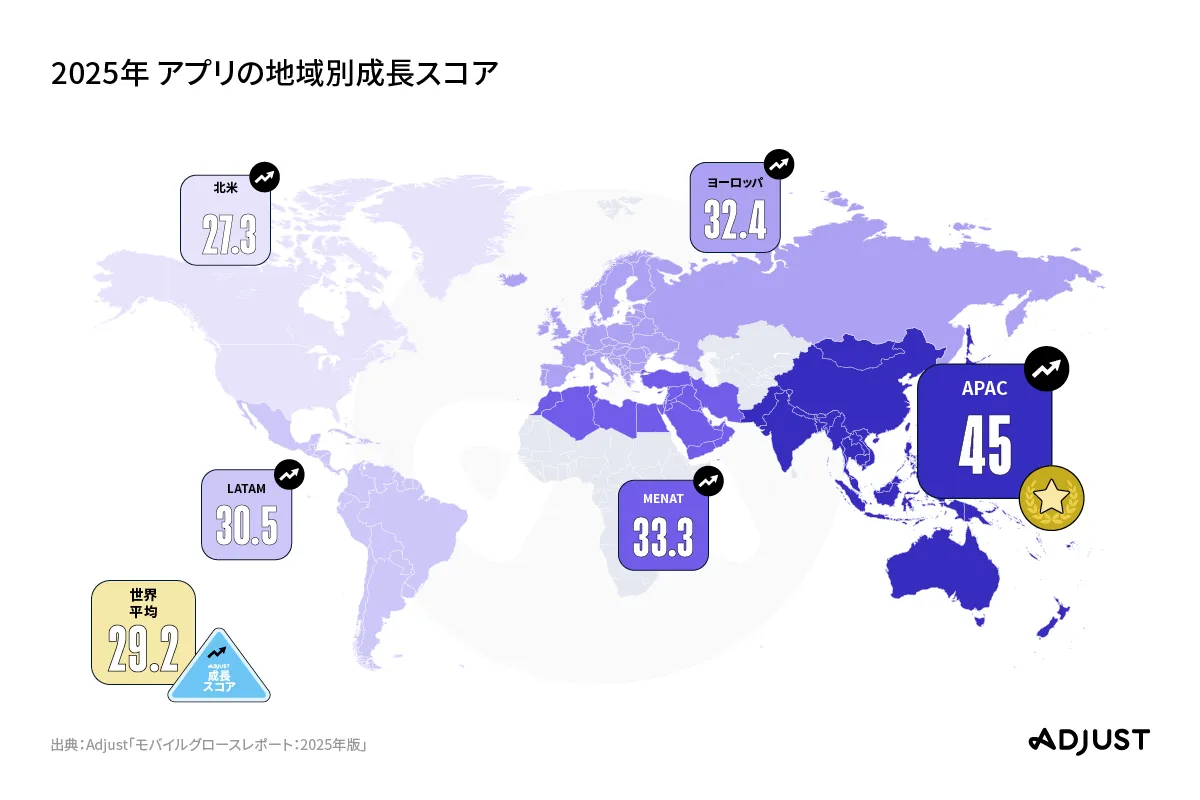 レポートでは、5,000以上の主要アプリを分析し、モバイルアプリエコノミーの成長が見込まれる地域や状況、さらにはユーザー獲得の可能性が最も高い領域を特定しました。Adjustによる成長スコアは、インストール数やインバースCPI、ユーザーの1日あたりセッション数、継続率の4つの重要要素を基に算出しています。そして、2025年の世界平均スコアは29.2となり、各地域や国、カテゴリーのパフォーマンスを示すベンチマークとしての役割を果たします。