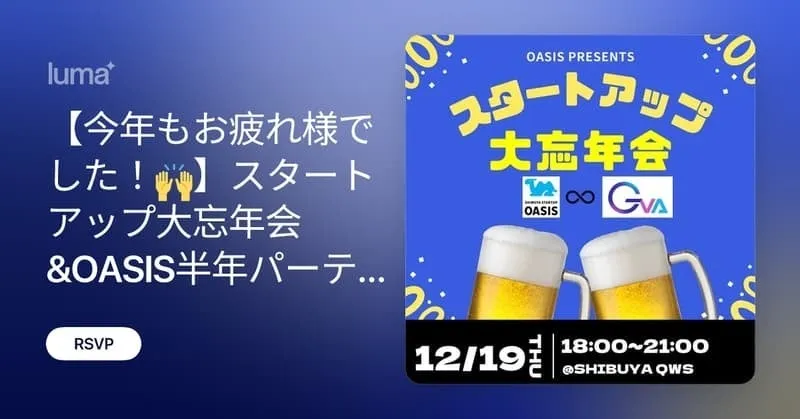 スタートアップとベンチャー企業が活躍する中、2024年の年の瀬が近づいてきました。今年もお疲れ様でした!スタートアップ界隈で挑戦を重ねてきた皆様に向けて、特別なイベント『スタートアップ大忘年会&OASIS半年パーティー』が12月19日に開催されます。