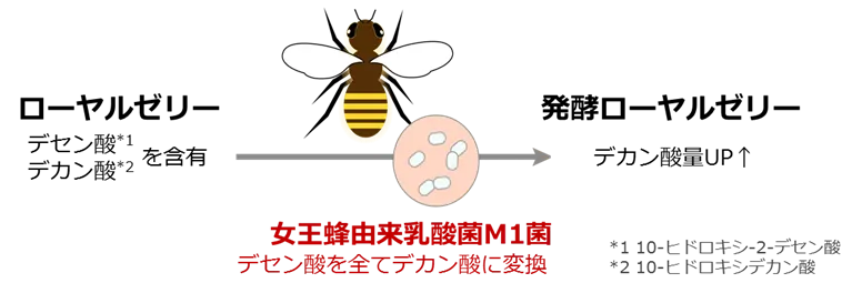157株の乳酸菌から選別した結果、M1菌はローヤルゼリー中のデセン酸をデカン酸に変換する能力を持つことが確認されました。この研究によって、発酵ローヤルゼリーが開発され、その中のデカン酸の量が5倍に増加することができました。この新しいローヤルゼリーは、デカン酸の特性を活かし、免疫機能の強化が期待されています。