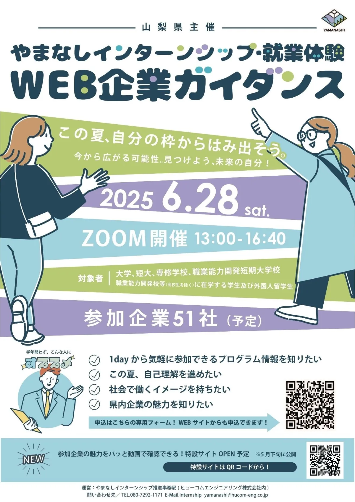 このWEBガイダンスは、令和7年6月28日(土)の13:00から16:40までの間に開催され、Zoomを使用して行われます。参加は無料で、山梨県に本社や事業所を持つ51社の企業が集まります。