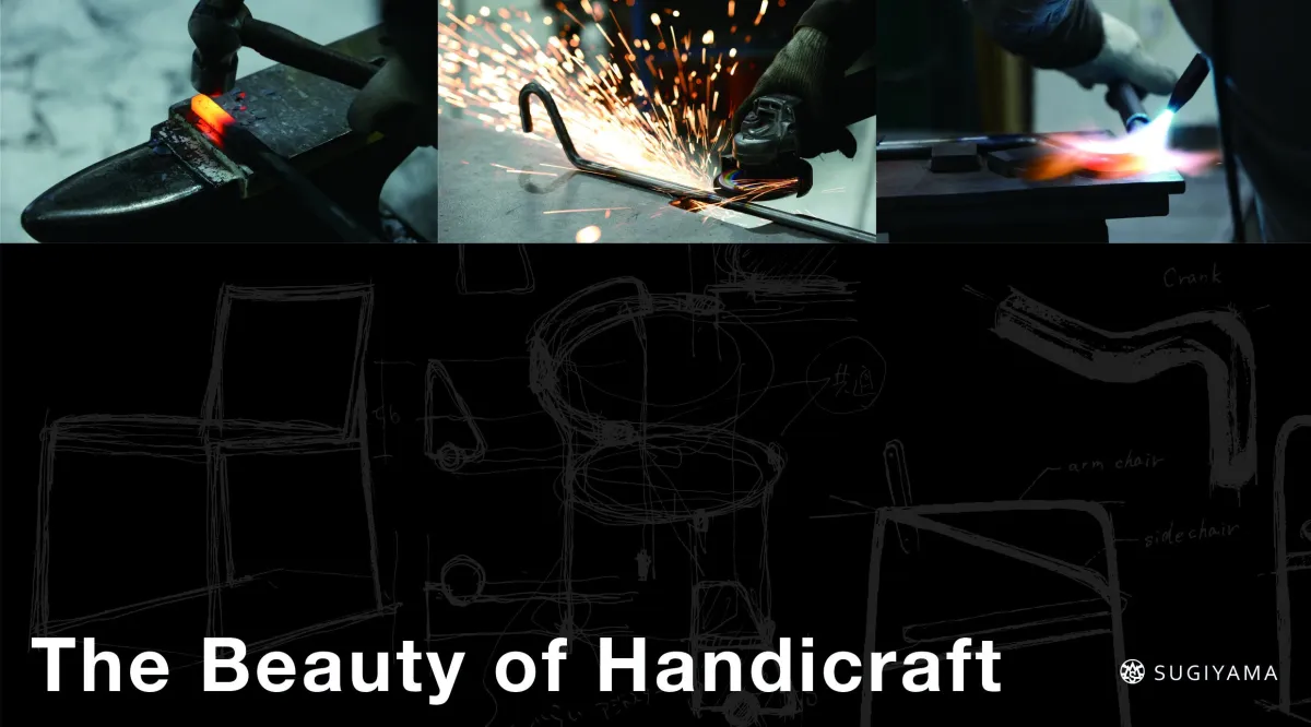 SUGIYAMAのモノづくりは、ただ形を作るだけでなく、鉄という無機質な素材に生命を吹き込むことを目指しています。デザイナーの創造力と鉄職人の熟練した技術が結集し、無造作な棒や板が心地よい鉄家具へと生まれ変わります。彼らの手による「切る」「曲げる」「たたく」「つなぐ」「けずる」といったプロセスが、独自の表情と質感を生み出すのです。これはまさにSUGIYAMAのモノづくりの真髄。手仕事が生み出す構成美や線美を通じて、鉄家具の美しさを再定義し、生活空間に特別な価値を提供することを目指しています。