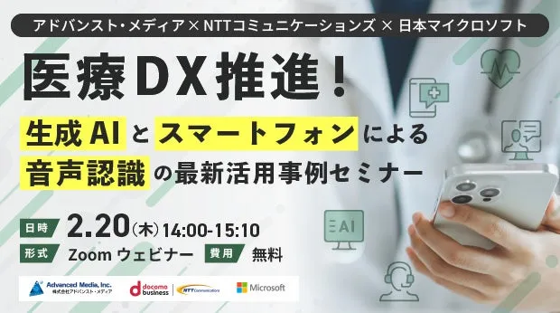 2025年2月20日(木)、株式会社アドバンスト・メディア、NTTコミュニケーションズ、そして日本マイクロソフトの三社による共同開催のオンラインセミナー「医療DX推進!生成AIとスマートフォンによる音声認識の最新活用事例セミナー」が行われます。このセミナーは、医療機関が直面している課題解決のため、医療DX(デジタルトランスフォーメーション)の重要性を深く理解するための機会です。