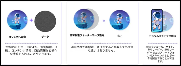 この技術は、画像や映像の中にデータを隠すことができるもので、外観には一切影響を及ぼさないため、視覚的な変更が不要です。従来のバーコードやQRコードでは実現できなかった、完全な非可視性を特徴としています。また、破損や変形を伴う場合でも、その情報を維持できる高い堅牢性も誇っています。