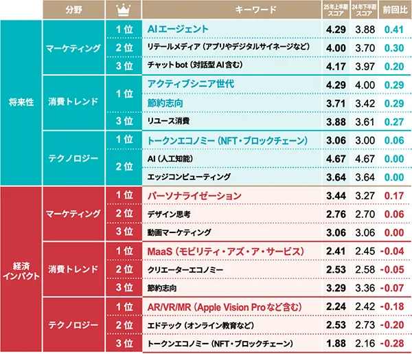 日経クロストレンドでは、2025年4月に調査を行い、特にこの3つの分野のキーワードを詳細に分析しています。専門家や編集部の意見を集約した結果、前回の調査からのトレンドの変化を捉え、比較的急速に成長するキーワードが明らかとなりました。