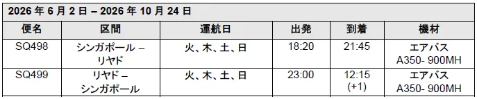 実際の運航に関しては、現地時間でシンガポール発リヤド行きのフライトSQ498は火曜日、木曜日、土曜日、日曜日の18時20分に出発。同じ曜日の23時にリヤド発のフライトSQ499がシンガポールに向けて出発する予定である。運航にはエアバスA350-900中距離型機が使用され、ビジネスクラスが40席、エコノミークラスが263席の計303席の編成となる。