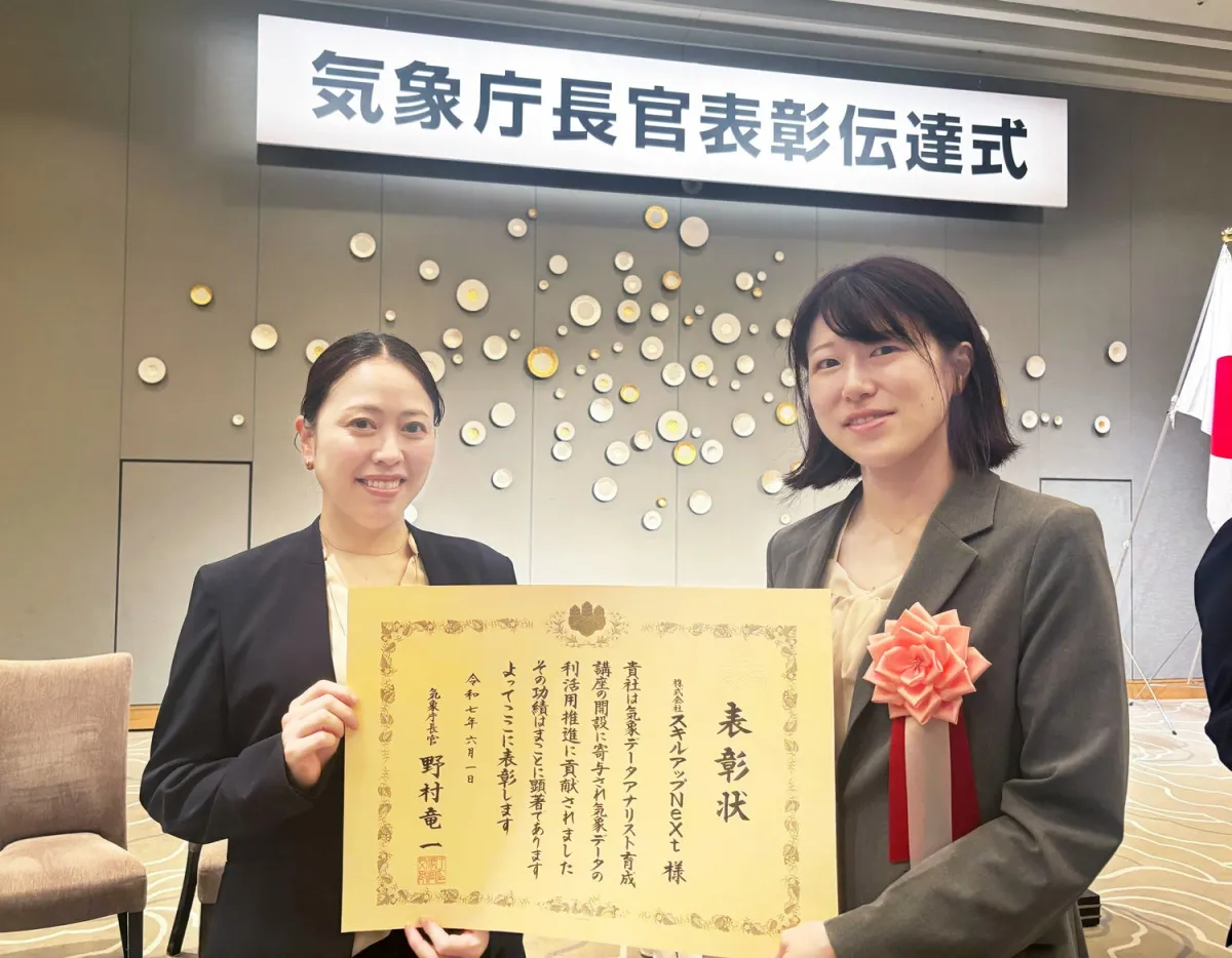 株式会社スキルアップNeXtは、気象データの利活用を推進するための「気象データアナリスト養成研修コース」で、気象庁からの「気象庁長官表彰」を受けたことを発表しました。この表彰は、スキルアップNeXtが提供している研修コースが、気象データの使用促進に寄与したことを評価された結果です。