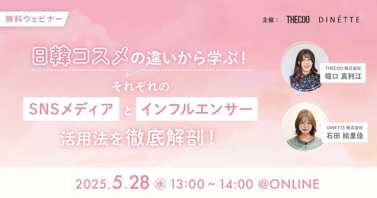 2025年5月28日、THECOO株式会社とDINETTE株式会社が共催する無料ウェビナーが開催されます。このウェビナーでは、日本の美容市場で注目を集めている韓国コスメの最新トレンドと、日韓におけるSNSマーケティング戦略の違いについて詳しく解説します。