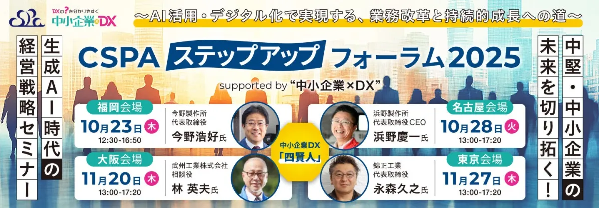 2025年10月23日から12月27日まで、福岡、名古屋、大阪、東京の4都市で「CSPA ステップアップフォーラム 2025」が開催されます。このイベントは、中堅・中小企業向けに“半日で経営の打ち手を掴む”ことを目的としており、参加は無料(事前登録制)です。