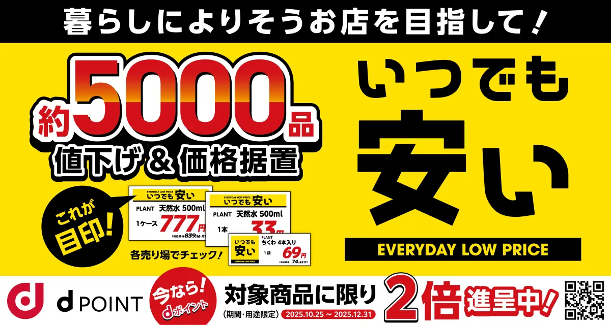 株式会社PLANTは、福井県坂井市に本社を構える企業で、地域に根ざした安価で質の高い商品提供を目指しています。2025年10月1日より、全23店舗で「エブリデイロープライス」を実施し、生活必需品を中心に約5,000点の商品を今まで以上にお求めやすく提供することを発表しました。