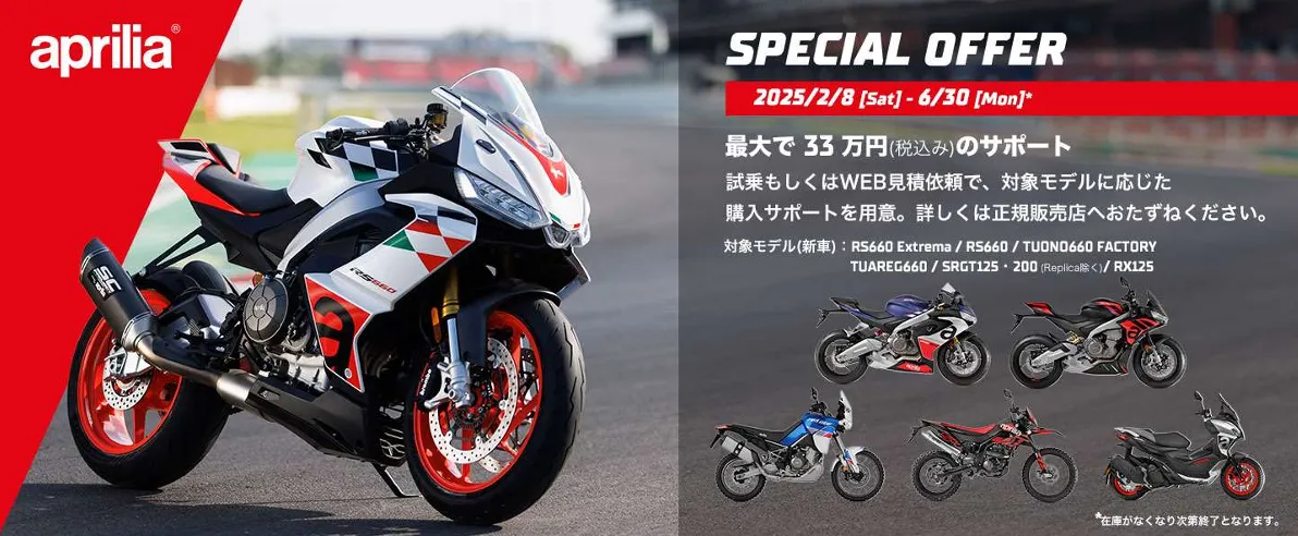 ピアッジオグループジャパン株式会社が、アプリリアの魅力的なスポーツバイクをお得に購入できる『SPECIAL OFFER』キャンペーンを、2025年2月8日(土)から6月30日(月)までの期間、全国のアプリリア正規販売店で実施します。このキャンペーンは、アプリリアのスタイリッシュなデザインと、優れたレーシングテクノロジーを満喫できるスポーツバイクへの大きなサポートとなることでしょう。