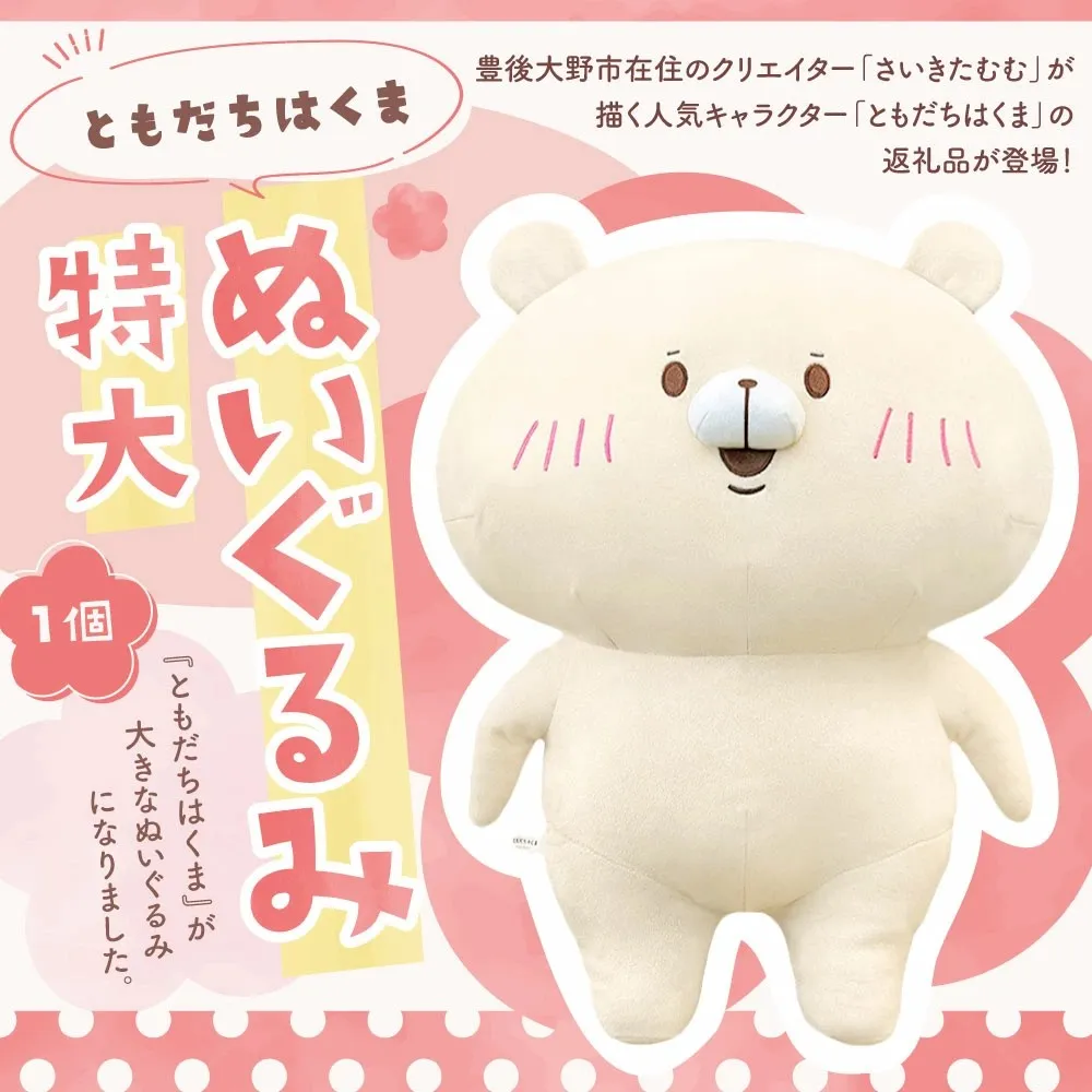 大分県豊後大野市は、ふるさと納税の返礼品として、エイノバ株式会社がマネジメントする人気クリエイター「さいきたむむ」が描くキャラクター「ともだちはくま」の特大ぬいぐるみを新たに追加しました。この特大サイズのぬいぐるみは、約55cm×40cmと大きく、ふわふわの布生地を使用しているため、見ているだけで癒されるような温かみのあるデザインが特徴です。
